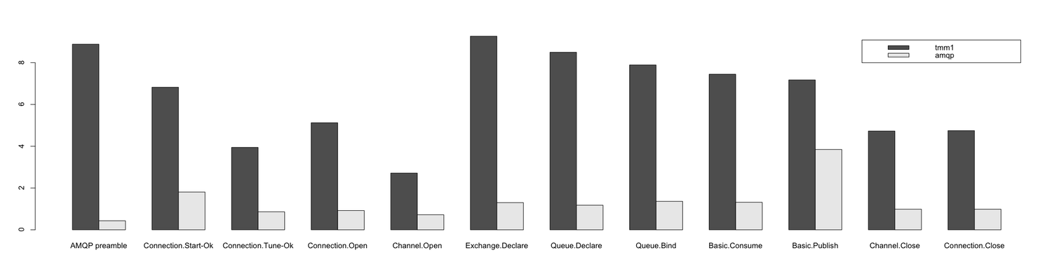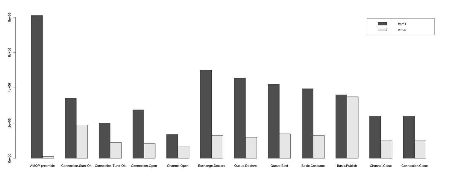 I'm not going to write about technical details of these benchmarks, get the sources and take a look yourself. I run every example 50,000 times, except of the example for the AMQP preamble which I run 200,000 times.